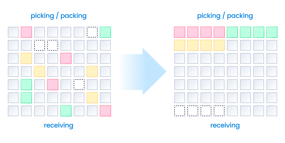 Optimize stock locations and picking routes by analyzing and reallocating inventory based on expiration dates and volumes. Prevent item loss, free up idle space, and acquire additional shippers. |